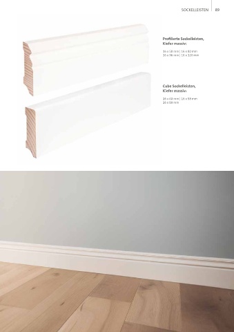 SOCKELLEISTEN 89 Profilierte Sockelleisten, Kiefer massiv: 16 x 58 mm | 16 x 80 mm 16 x 96 mm | 16 x 120 mm Cube Sockelleisten, Kiefer massiv: 16 x 40 mm | 16 x 58 mm 16 x 80 mm